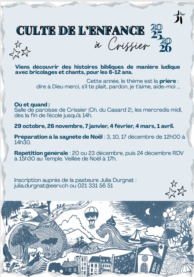 Inscription auprès de la pasteure Julia Durgnat : julia.durgnat(at)eerv.ch ou 021 331 56 51