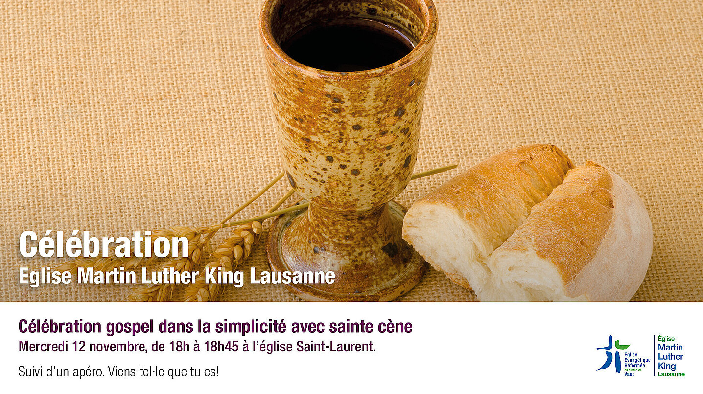 Prendre le temps de s'arrêter, d'écouter la Parole et de partager le Repas du Seigneur, en toute simplicité, voilà ce qui est proposé le mercredi 12 novembre à 18h à l'église Saint-Laurent. Un temps de ressourcement et de partage, saupoudré de quelques chants gospel, organisé par l'Eglise MLK Lausanne. Viens tel·le que tu es !