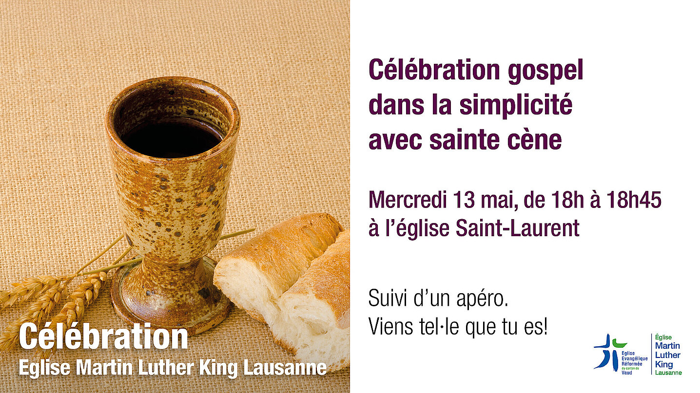 En cette semaine de l'Ascension, prendre le temps de s'arrêter, d'écouter la Parole et de partager le Repas du Seigneur, en toute simplicité, voilà ce qui est proposé le mercredi 13 mai à 18h à l'église Saint-Laurent. Un temps de ressourcement et de partage, saupoudré de quelques chants gospel, organisé par l'Eglise MLK Lausanne. Viens tel·le que tu es !