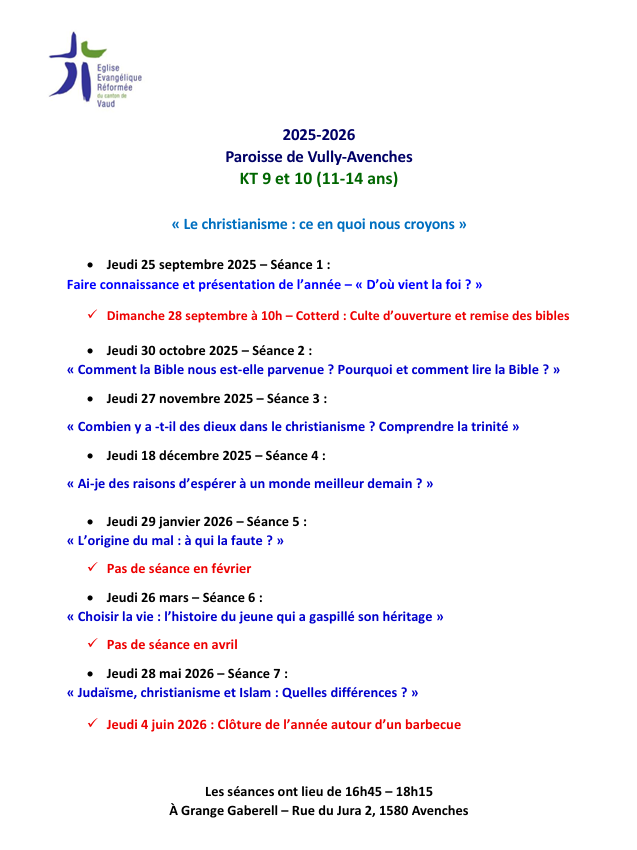 Le programme de catéchisme pour les jeunes de 11 à 14 ans qui suivent leur 9ème et 10ème année scolaire, appelé aussi KT 9 et 10, a débuté jeudi 25 septembre. Envie de rejoindre le groupe ou informations complémentaires nécessaires ? Le pasteur Christo Karawa vous renseigne volontiers.