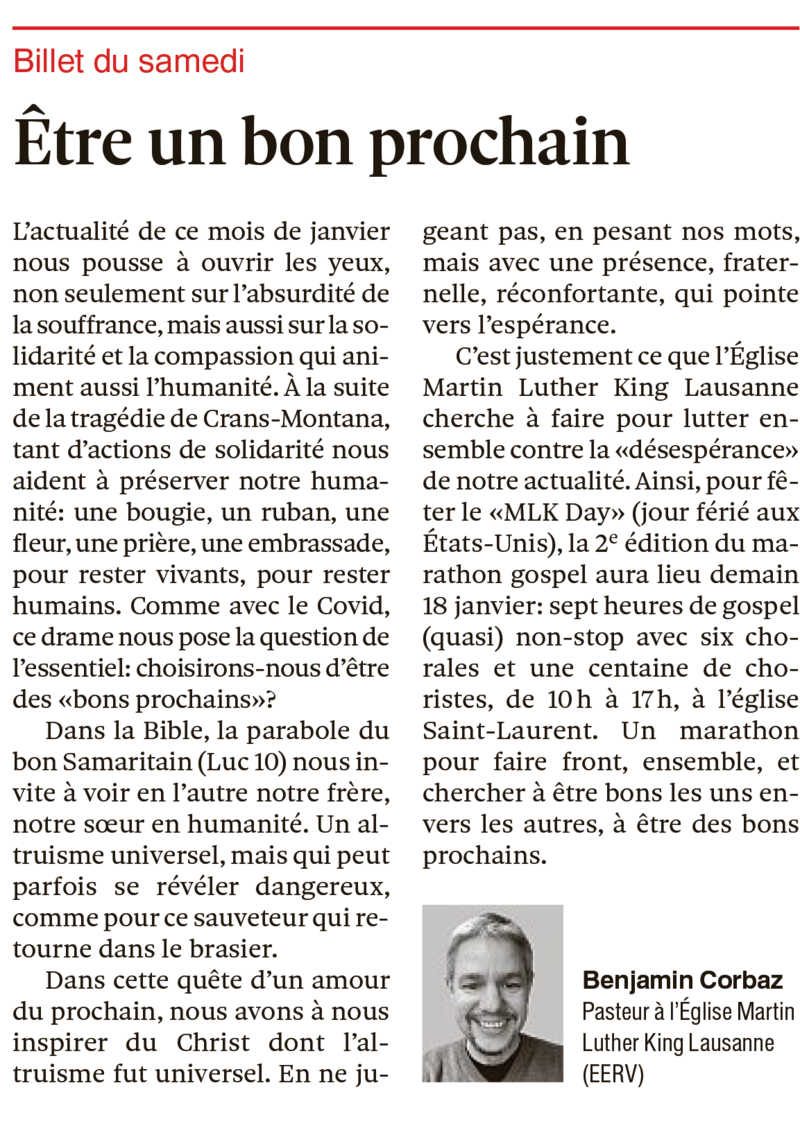 Par Benjamin Corbaz Pasteur à l’Église Martin Luther King Lausanne (EERV)