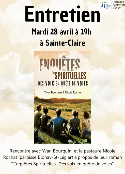 Mardi 28 avril, à 19h, à Sainte-Claire à Vevey, conférence avec Yvan Bourquin et Nicole Rochat “Enquêtes spirituelles - des voix en quête de voies”. Informations auprès de Nicole Rochat, pasteure à la paroisse de Blonay - Saint-Légier.
