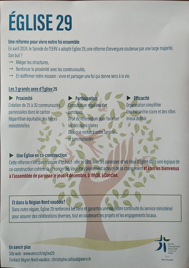 Une grande réorganisation se prépare au sein de l'EERV, le projet “Église 29” vise à passer de 88 paroisses actuellement dans le canton à 25 à 30 dans le futur. Notre paroisse aura donc une taille bien différente.