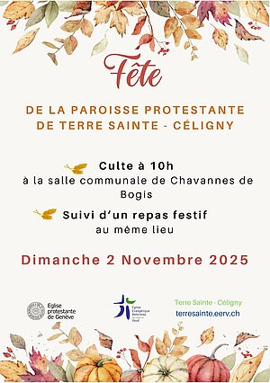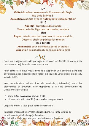 Publié leNous avons le plaisir de vous annoncer que notre Fête de la Paroisse aura lieu, cette année, le 2 novembre à la salle communale de Chavannes-de-Bogis.