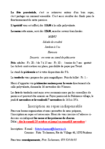 Inscriptions obligatoires auprès de Fritz Tschannen fritz.tschannen(at)bluewin.ch ou 079 324 06 95 (entre le 25.10 et 08.11). Possibilité d’apporter des lots pour la tombola les jeudi 6 et vendredi 7 novembre de 16h à 19h au foyer paroissial de Palézieux.