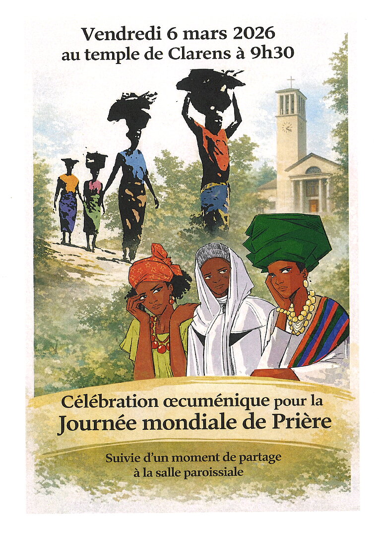 Vendredi 6 mars, à 9h30, au temple de Clarens, bienvenue à la célébration oecuménique dans le cadre de la journée mondiale de prière. Elle sera suivie d'un moment de partage à la salle paroissiale à côté de l'église.