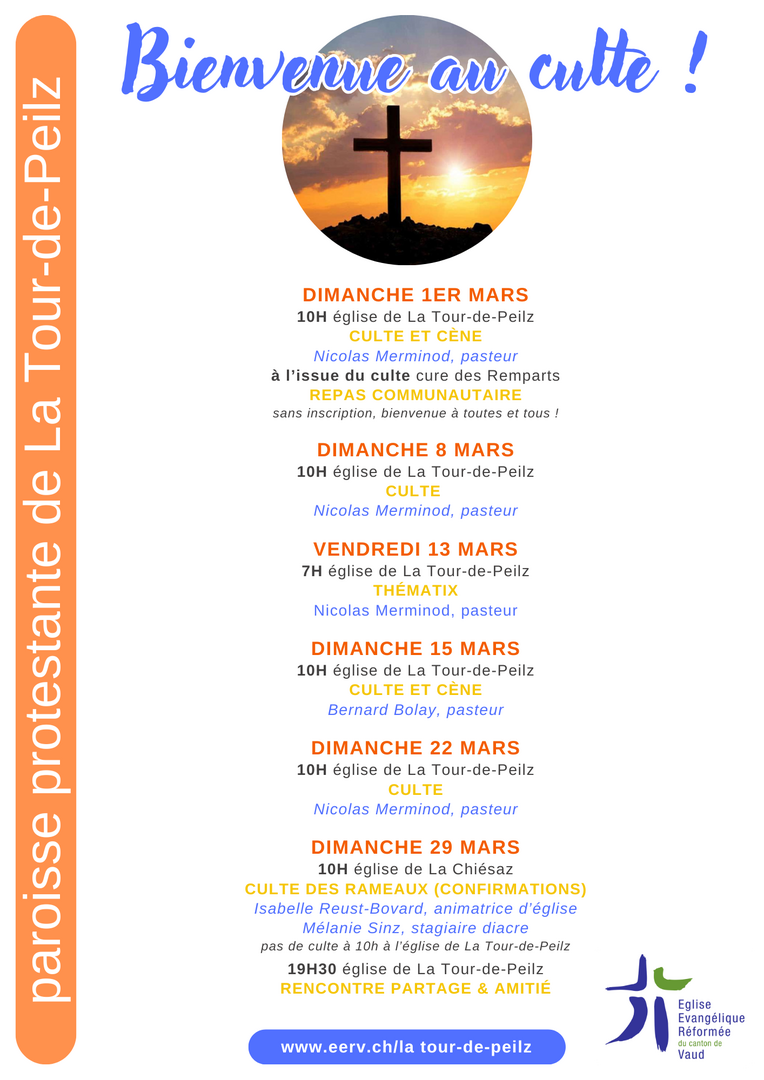 Retrouvez le détail des cultes à la paroisse de La Tour-de-Peilz au mois de mars 2026