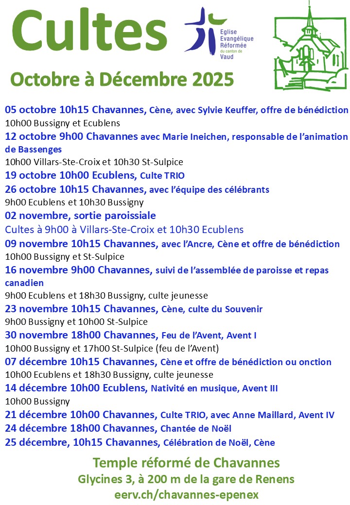 Nous avons régulièrement le plaisir d’accueillir les ministres d’autres paroisses de l’Ouest lausannois. L’agenda de notre page d’accueil (ou le journal Réformés du mois) indique le nom des célébrant(e)s et si une Sainte-Cène et/ou un après-culte sont prévus.