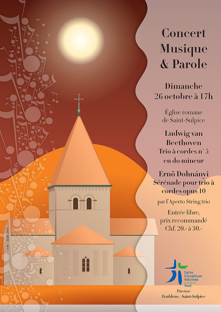 Le talentueux ensemble Aperto String Trio vous convie à ce concert méditatif, avec des oeuvres de Beethoven et de Ernő Dohnănyi. Entrée libre- Collecte à la sortie (prix recommandé Fr. 20-/ 30.-).