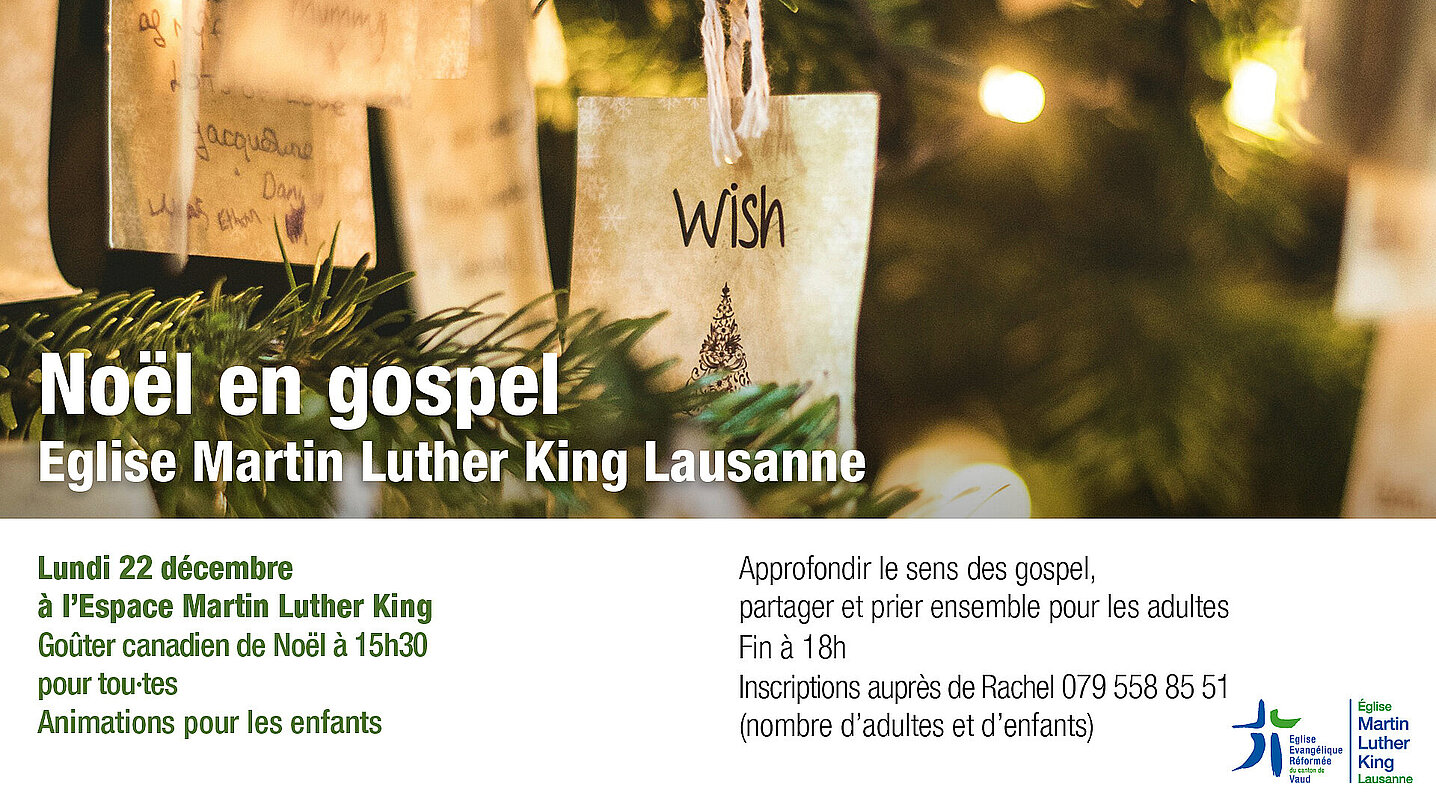 Lundi 22 décembre 202, venez fêter Noël en famille avec, à 15h30, un goûter canadien de Noël pour tous, puis des animations pour les enfants pendant que les adultes peuvent approfondir le sens des gospel, partager et prier ensemble. Fin à 18h. Inscriptions auprès de Rachel 079 558 85 51 (avec le nombre d'adultes et d'enfants).