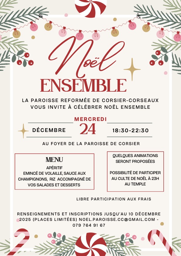 Venez passer Noël avec nous ! Nous mangerons ensemble avec un menu de fête agrémenté par vos salades et desserts ! Quelques animations vous seront proposées. Si vous le souhaitez nous poursuivrons la soirée à 23h au temple de Corsier pour la veillée de Noël.