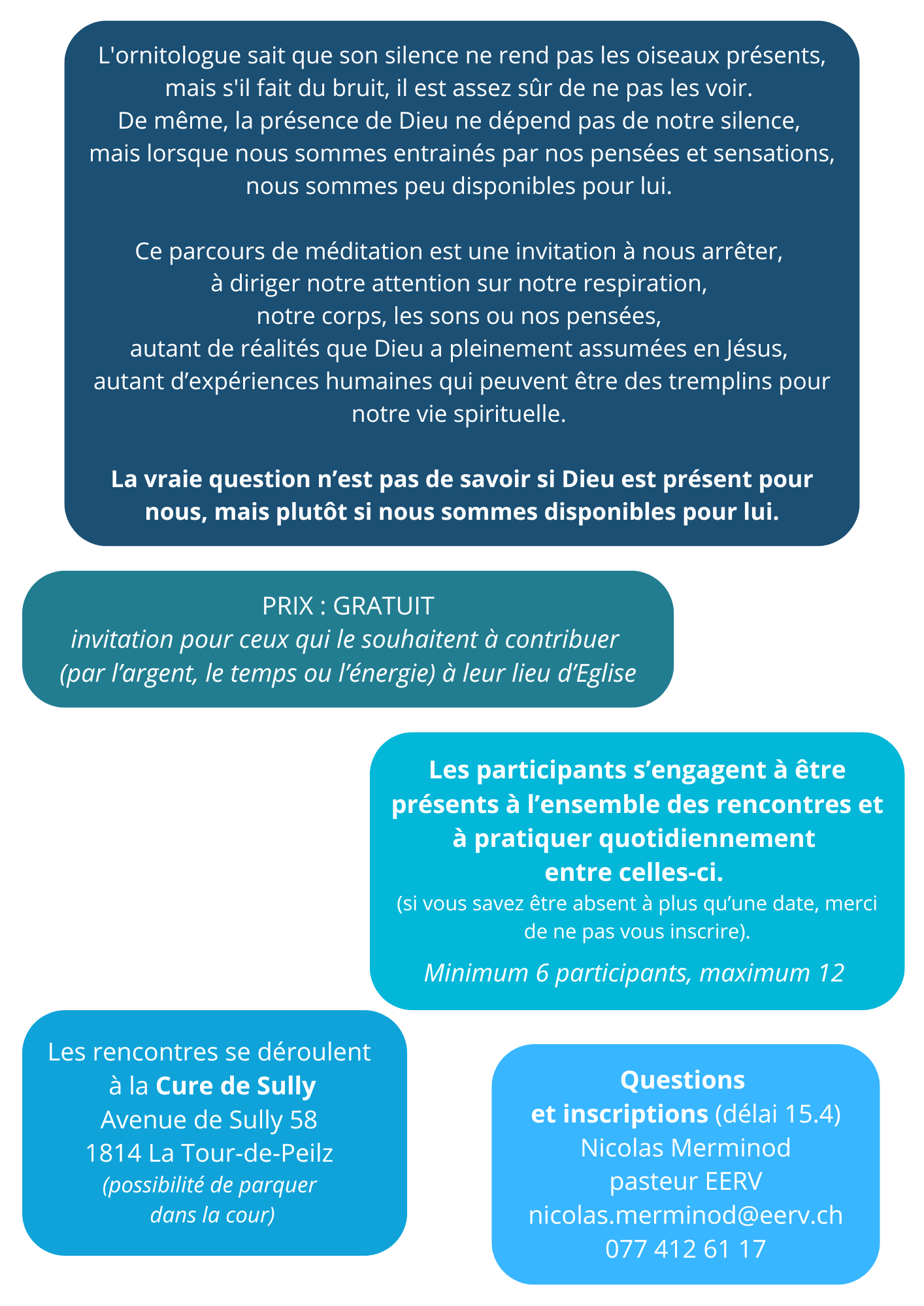 Le pasteur Nicolas Merminod propose une initiation à la méditation sur un cycle de 8 rencontres, d'avril à juin, à la cure de Sully, avenue de Sully 58, à La Tour-de-Peilz :
