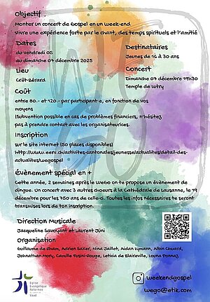 Du 5 au 7 décembre 2025, la Chorale Gospel des jeunes WEGO se réunit à Crêt-Bérard pour un week-end de musique, d’amitié et de foi. Encadrés par Jacqueline Savoyant et Laurent Jüni, les participants (âgés de 16 à 30 ans) monteront un concert de gospel en seulement trois jours !