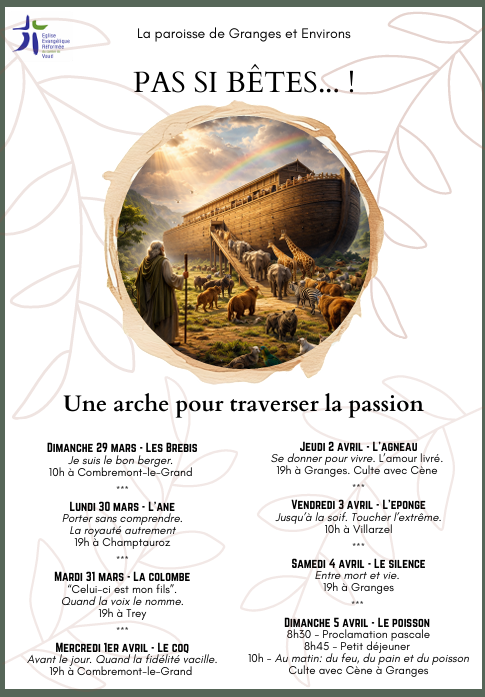 Ce culte du 29 mars est également la première rencontre de la Semaine sainte “Une arche pour traverser la passion”, sur le thème : Les Brebis - Je suis le bon berger.