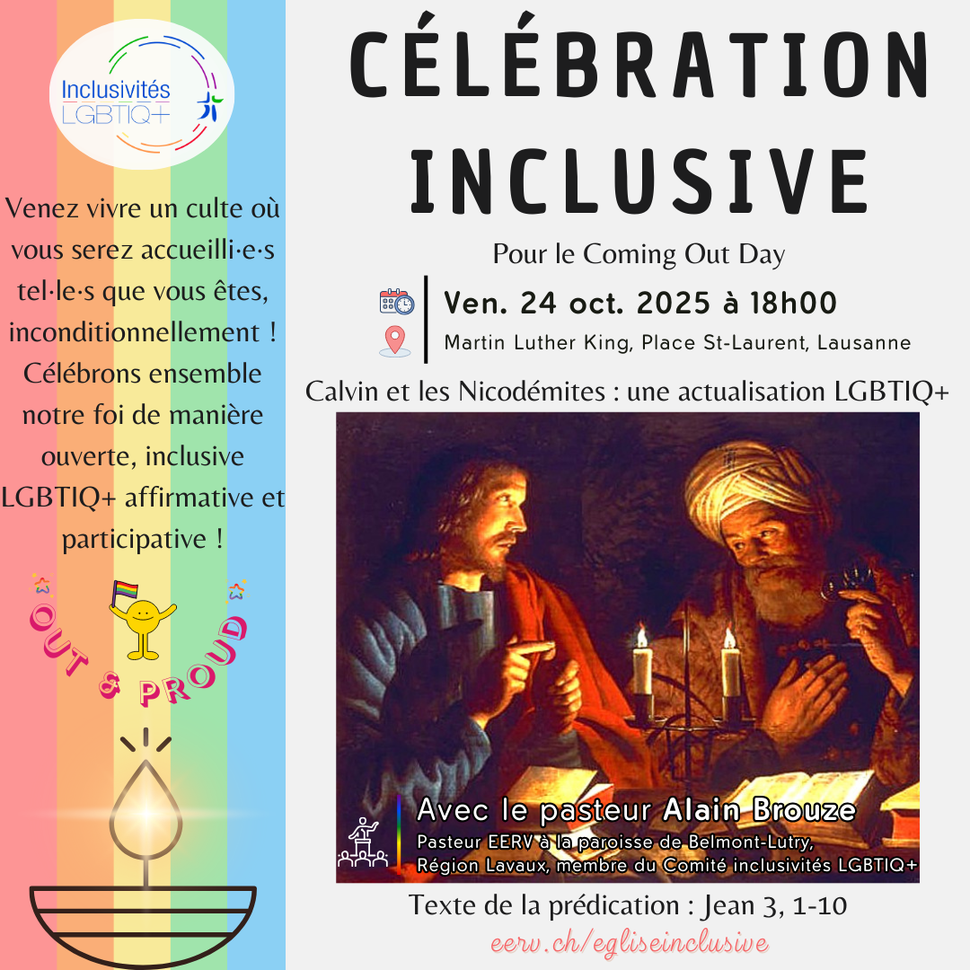 Avec en toile de fond les écrits de Calvin sur les "Nicodémites", nous actualiserons ce questionnement à la lumière des expériences des personnes LGBTIQ+, souvent appelées à naviguer entre visibilité, foi personnelle et institutions religieuses.