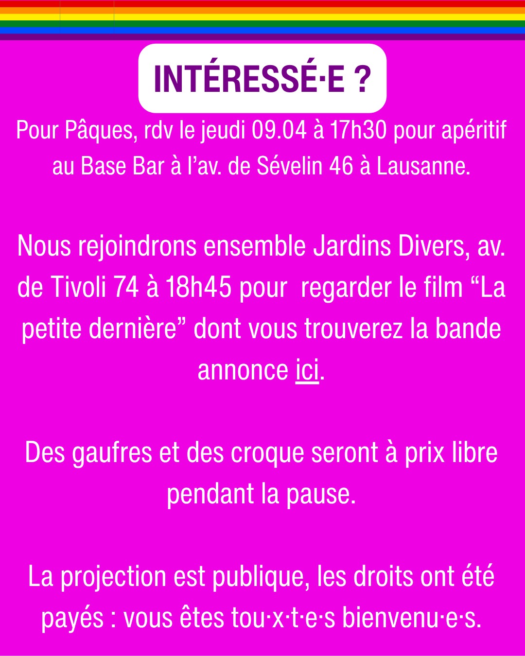Lieu de rencontre pour la soirée film 18h30 : Jardins Divers, Avenue de Tivoli 74, 1007 Lausanne