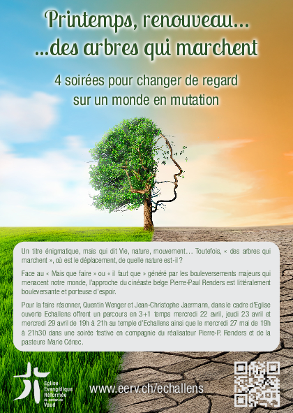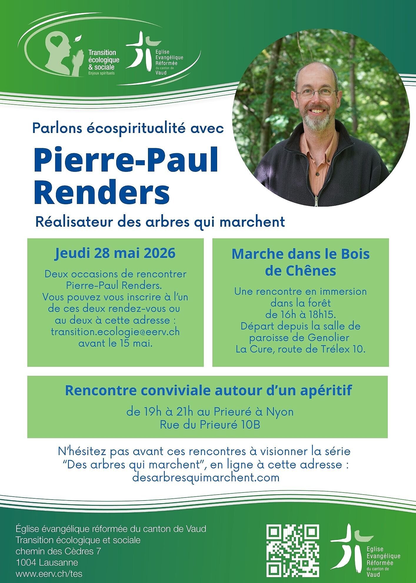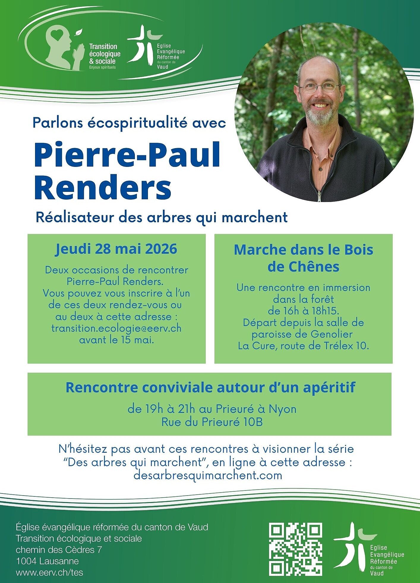 Pierre-Paul Renders, le réalisateur de la série documentaire « Des arbres qui marchent » fait une tournée dans l’EERV, à la rencontre des personnes qui ont vu sa série et qui souhaiteraient poursuivre la réflexion avec lui.