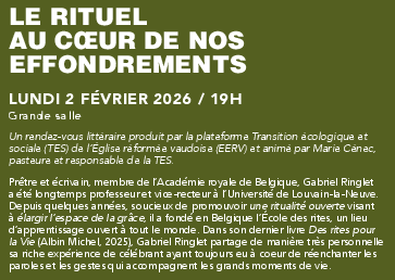 La plateforme TES vous propose un rendez-vous littéraire, animé par Marie Cénec, pasteure et responsable de la TES à l'EERV, autour du dernier livre de Gabriel Ringlet Des rites pour la Vie (Albin Michel, 2025).