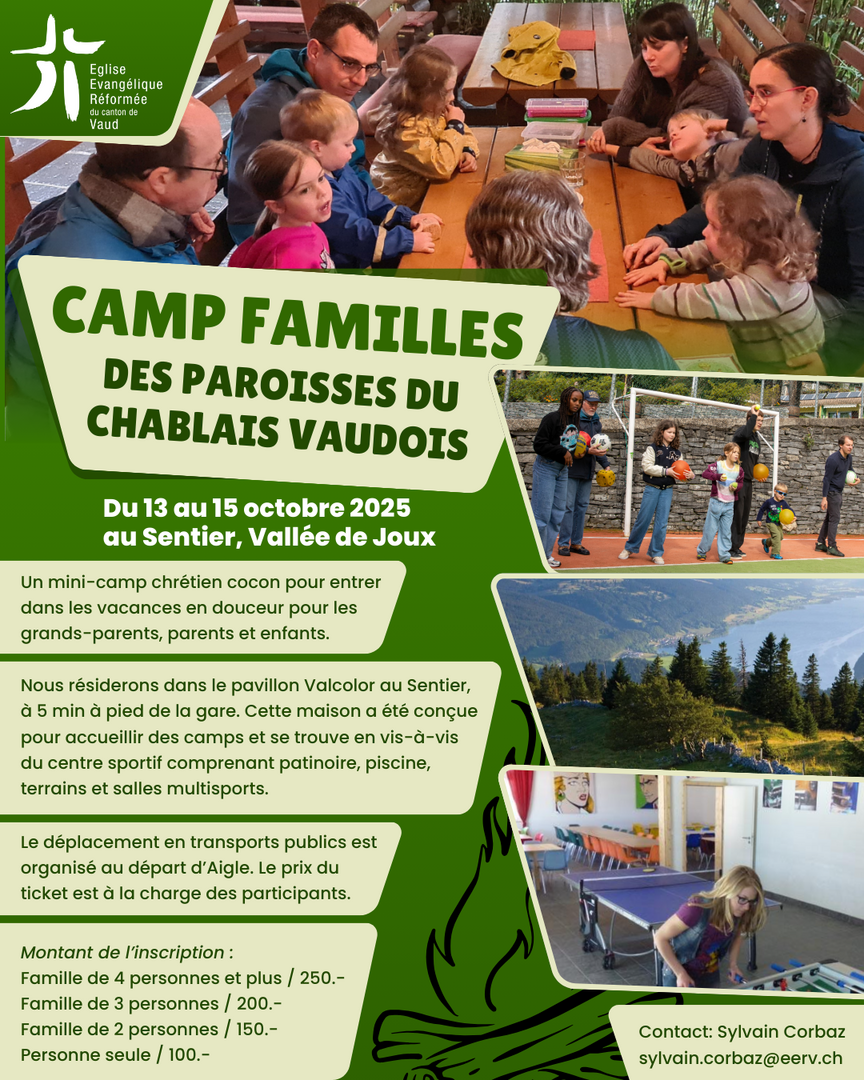 Un mini camp chrétien cocon afin de commencer les vacances en douceur, pour les grands-parents, parents et enfants. Les participants seront logés au Pavillon Valcolor au Sentier, à cinq minutes à pied de la gare. Cette maison a été conçue pour accueillir des camps et se trouve en vis-à-vis du centre sportif comprenant patinoire, piscine, terrains et salles multisports.