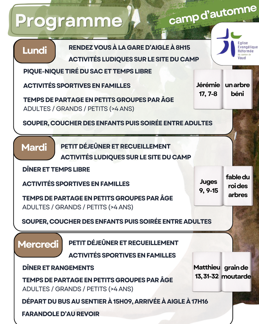 La thématique des arbres dans la Bible sera au cœur de ces quelques jours de camp. De tout temps, l’homme a vu en l’arbre une symbolique très riche, souvent liée à des pratiques religieuses. “Nous vous invitons alors à une ballade au pied de ces trois arbres, juste le temps de méditer sur notre vie, notre foi et la manière de la transmettre à nos enfants et petits-enfants" explique Sylvain Corbaz, pasteur et chef de camp.