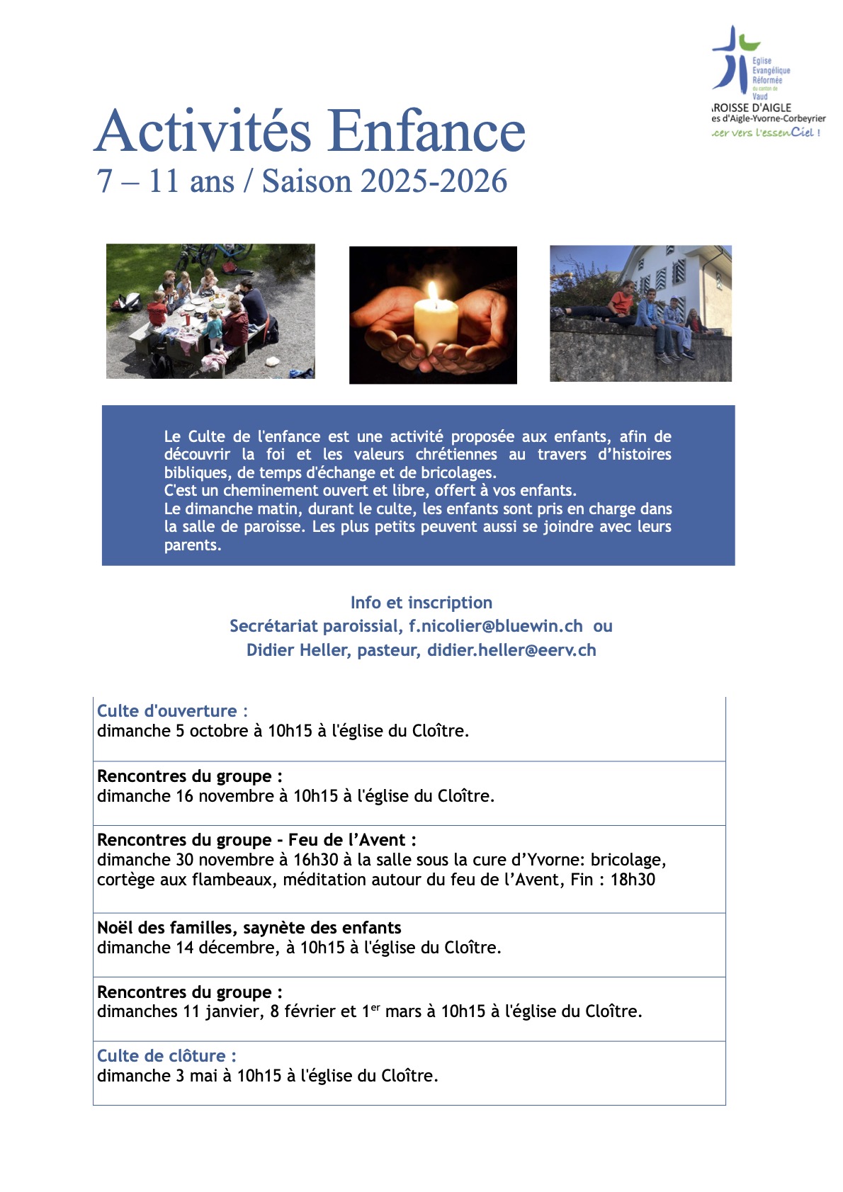 Le Culte de l'enfance est une activité proposée aux enfants, afin de découvrir la foi et les valeurs chrétiennes aux travers d'histoires bibliques, de temps d'échange et de bricolage. C'est un cheminement ouvert et libre, offert à vos enfants. L'activité a lieu le dimanche matin, durant le culte. Les enfants sont pris en charge dans la salle de paroisse. Les plus petits peuvent aussi les rejoindre s'ils sont accompagnés d'un parent.