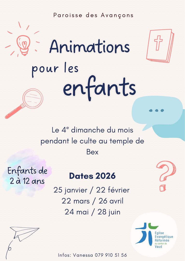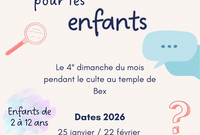 Des animations pour les enfants de 2 à 12 ans sont organisées le 4e dimanche du mois pendant le culte au temple de Bex.