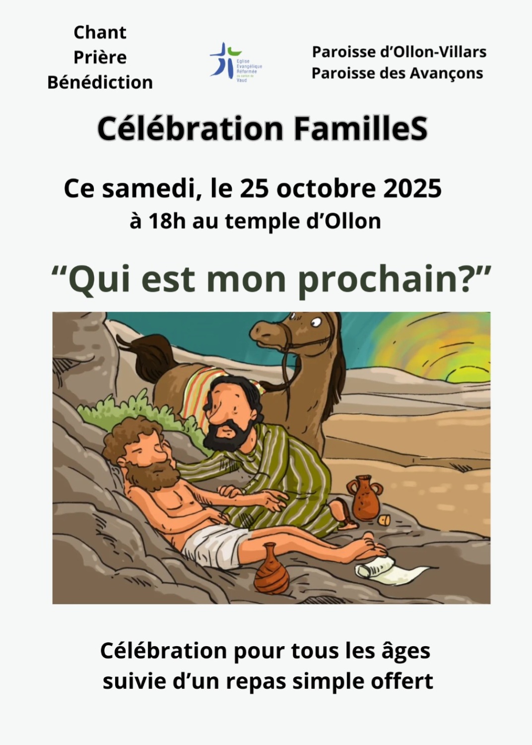 Le quatrième samedi du mois à 18h, au temple d'Ollon, petits et grands, des plus calmes ou plus tourbillonnants, chacun est le bienvenu pour ces temps de célébrations adaptés aux différentes tranches d'âge. Les célébrations sont suivies d'un repas simple à la salle de paroisse.