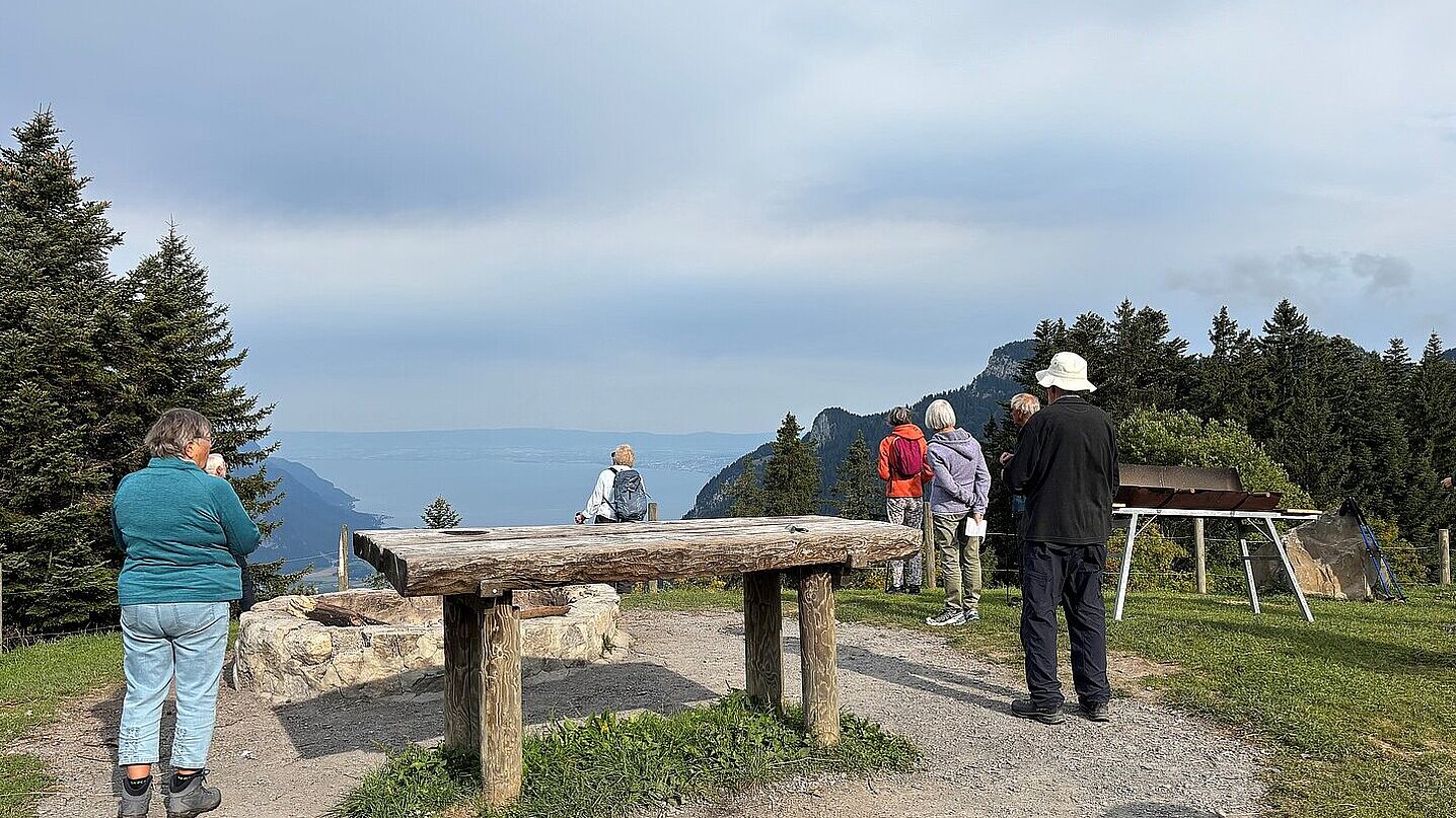 Pierre-Alain Mischler nous accueille avec quelques mots de bienvenue et distribue les psaumes et prières qui nous accompagneront. L’itinéraire sera court : les trois quarts du parcours se feront en silence. Nous commençons par un moment de contemplation face au lac Léman, dans le calme de la nature. Le sentier s’élève, nous prenons encore de la hauteur, cette fois avec le Chablais qui s’étend sous nos yeux. Arrivés au sommet, Pierre-Alain nous invite, à partir du psaume lu, à réfléchir : quelle est notre source de vie ?
