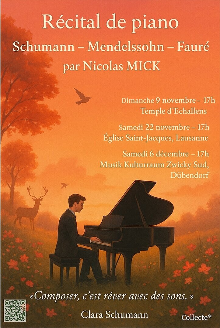 A côté de l’animation musicale des cultes, Nicolas Mick développe une carrière de musicien confirmé soucieux de pédagogie et de transmission. Il nous propose dimanche 9 novembre un concert qu’il donnera également en Allemagne mêlant compositeurs allemands et français. Au programme : “scènes d’enfants op. 15” de Schumann, “Romances sans paroles” de Mendelssohn, “3 barcarolles et 3 romances sans paroles op.17” de Fauré. Un florilège de pièces agrémentées de quelques interventions brèves sur les compositeurs et les œuvres pour une heure de concert.