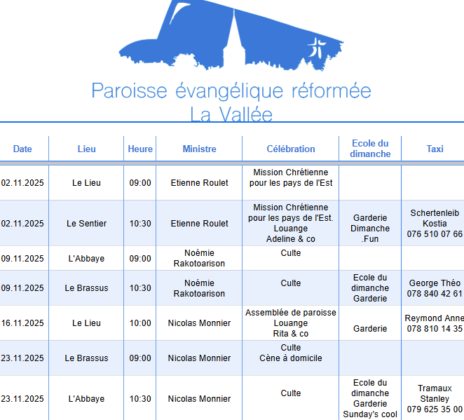 Retrouvez tous les cultes de la Paroisse EERV de la Vallée pour le mois de novembre du 2 novembre au 23 novembre