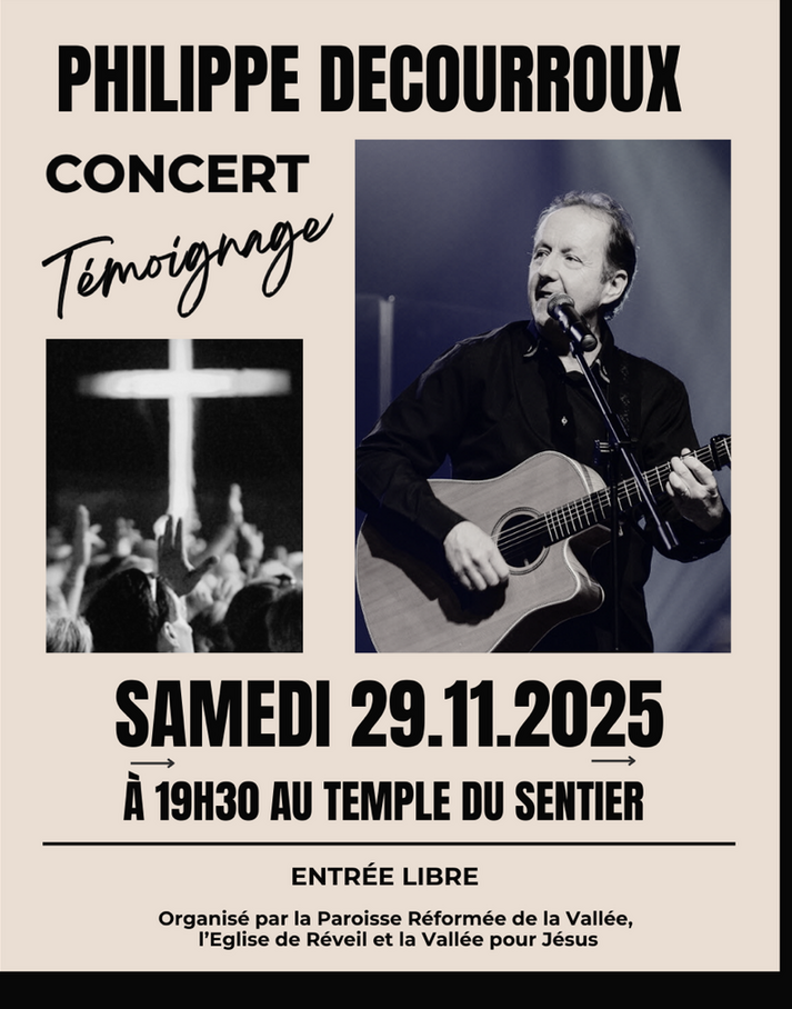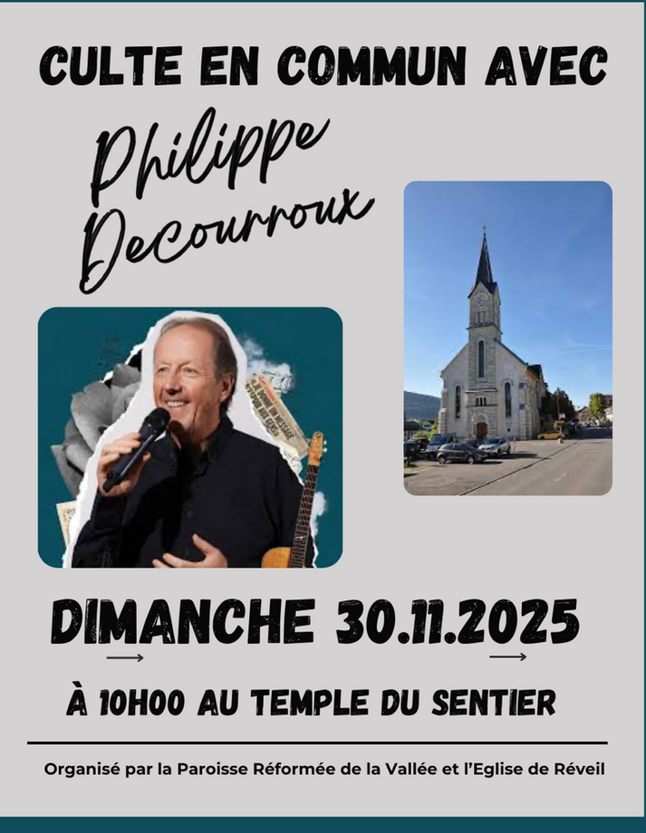 A l’occasion de la sortie du nouvel album de Philippe Decourroux, la paroisse a répondu à l’invitation de l’Eglise de Réveil d’inviter Philippe pour un concert le samedi 29 novembre, à 19h30, au temple du Sentier. Bienvenue à toutes et à tous pour cette soirée exceptionnelle. Entrée libre, chapeau à la sortie.