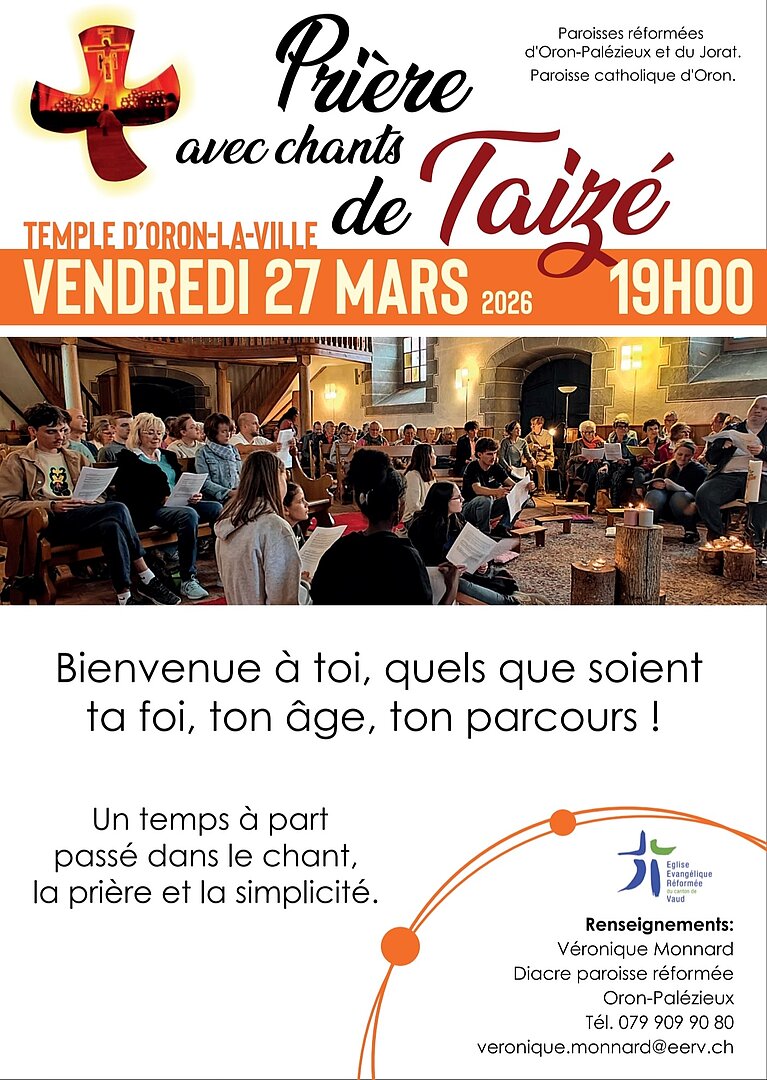 Vendredi 27 mars, à 19h, au temple d'Oron, la paroisse catholique d'Oron et les paroisses réformées d'Oron - Palézieux et du Jorat vous proposent un temps mis à part, dans le chant, la prière et la simplicité, comme à Taizé.