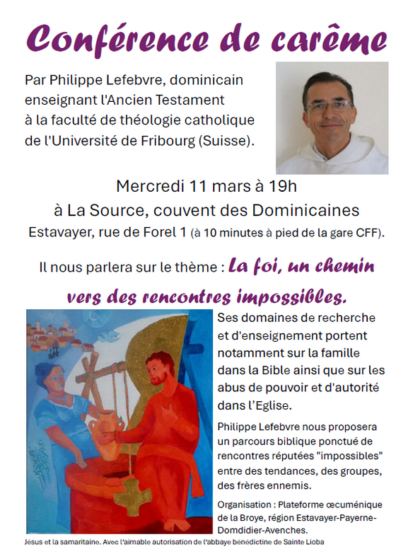 Mercredi 11 mars, à 19h, conférence à La Source, au Couvent des Dominicaines, à Estavayer. Le théologien Philippe Lefebvre abordera le thème "La foi, un chemin vers des rencontres impossibles".