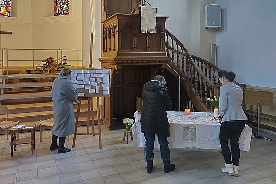 Musique et silence, possibilité de déposer une petite bougie, d’écrire un mot, une prière ou d’être écouté·e