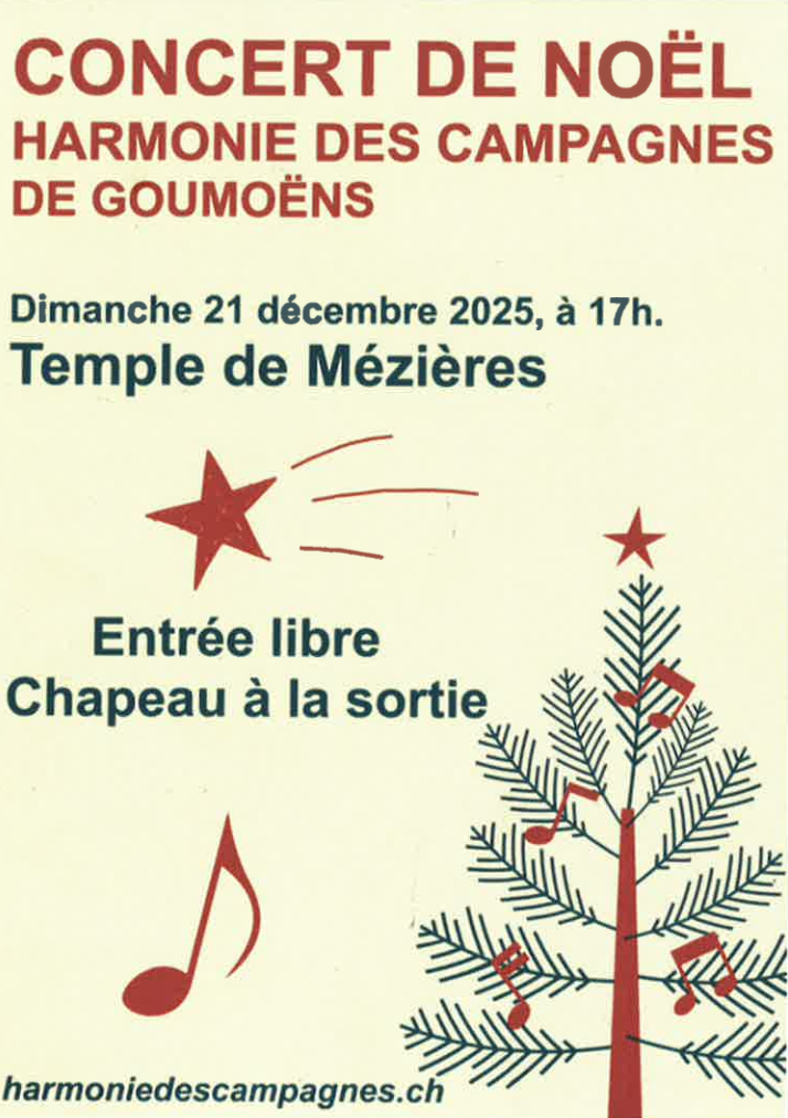 Dimanche 21 décembre, à 17h, à l'église de Mézières concert du choeur d'hommes de Goumoens-le-Jux, l'Harmonie des campagnes. Chants traditionnels de Noël de tous pays.
