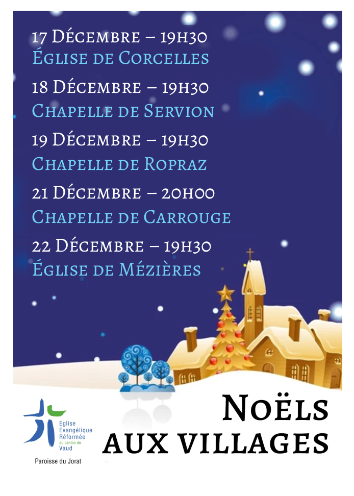Mercredi 24 décembre, 22h30, Montpreveyres : veillée de Noël, célébration, thé et vin chaud.