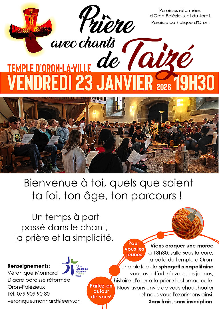 Vendredi 23 janvier, à 19h30, au temple d'Oron, prière avec chants de Taizé. Les spaghettis sont offerts aux jeunes, à 18h30, à la salle paroissiale, juste à côté du temple. Bienvenue sans inscription. Une façon de chouchouter la jeunesse.