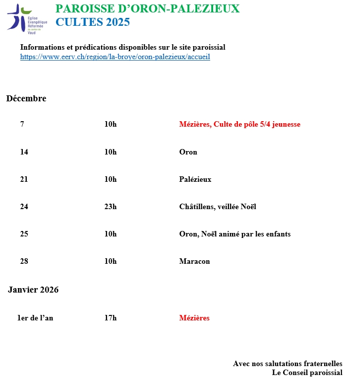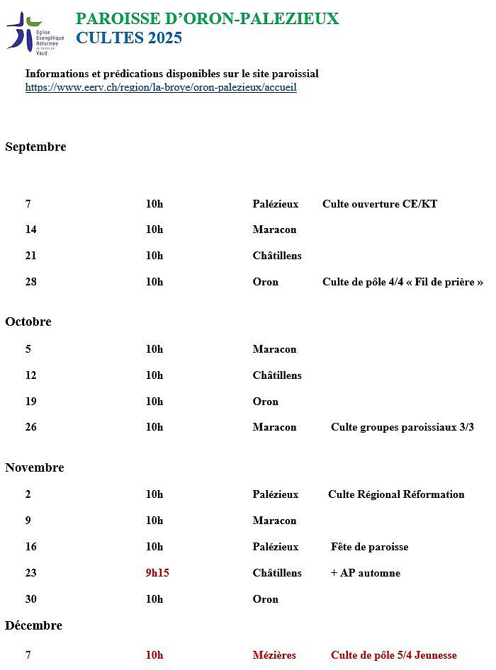 Sans autres indications, les cultes sont tous les dimanches à 10h