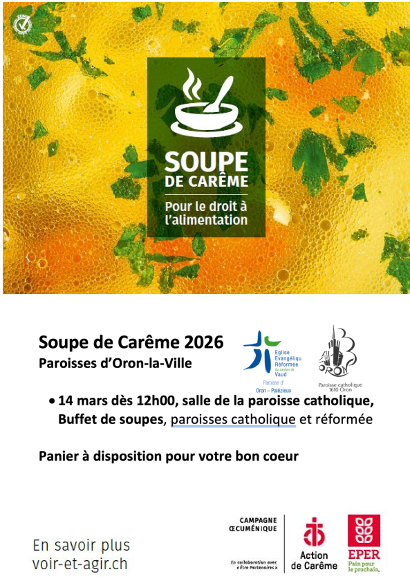 - dès 12h de la soupe de carême à la salle de paroisse de l’église catholique à Oron