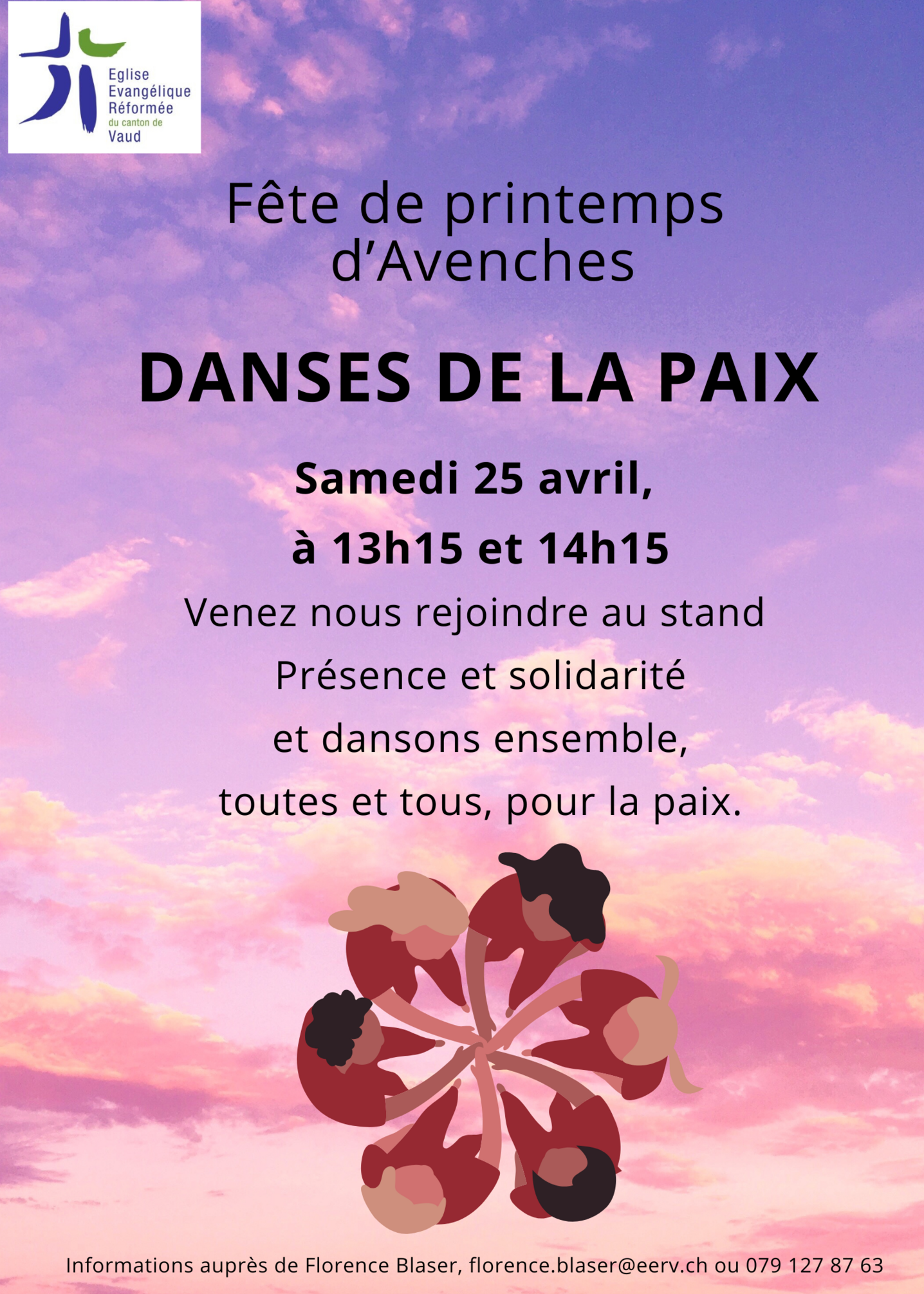 Venez faire connaissance au stand Présence et solidarité, aux côtés des Eglises, lors de la fête de printemps d'Avenches samedi 25 avril, de 10h à 17h, et participez spontanément aux « danses de la paix », ouvertes à toutes et tous, à 13h15 et 14h15.
