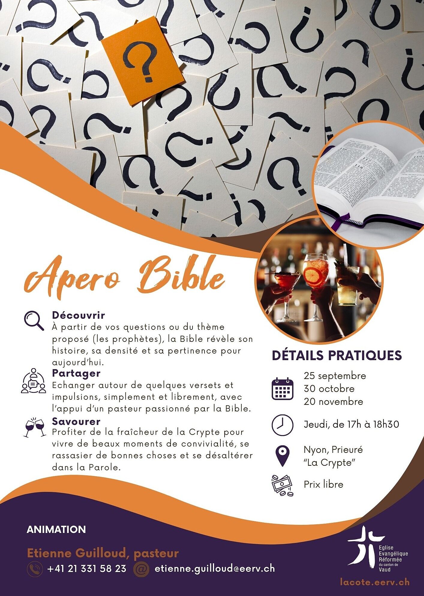 L'Apéro Bible est un moment simple et chaleureux où nous nous retrouvons pour échanger autour d'un texte biblique. C'est l'occasion de lire, de discuter et de poser toutes vos questions, sans jugement et dans la bonne humeur.