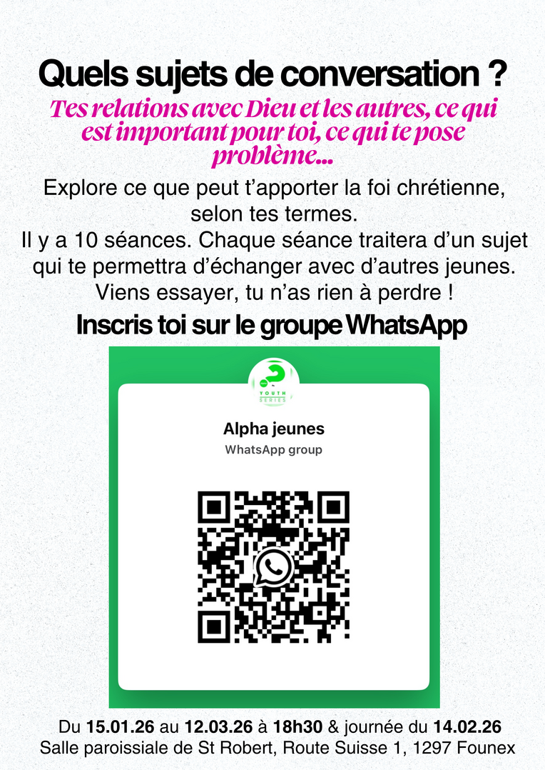 Chaque jeudi du 15.01.26 au 12.03.26 de 18h30 à 20h30 & journée du 14.02.26 à la salle paroissiale de l’Église St Robert, Route Suisse 1, 1297 Founex.