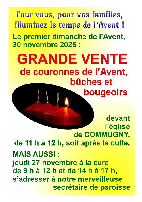 - Le jeudi 27 novembre, au secrétariat paroissiale de 9h à 11h30 et de 14h à 17h (les couronnes seront exposées à côté dans le jardin de la cure).