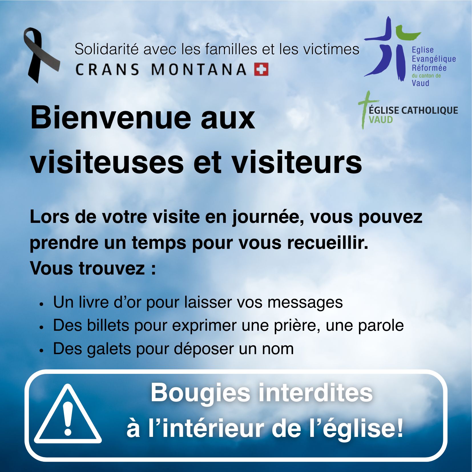 Suite aux veillées organisées tous les soirs jusqu'au 11 janvier, l’église d’Epalinges continue d'être ouverte pour votre recueillement de 8h à 20h tous les jours, et un cahier et des billets sont disponibles pour exprimer vos prières. Vous pouvez continuer de déposer vos bougies à l'extérieur de l'église, et vos bouquets dans ou hors de l'église.