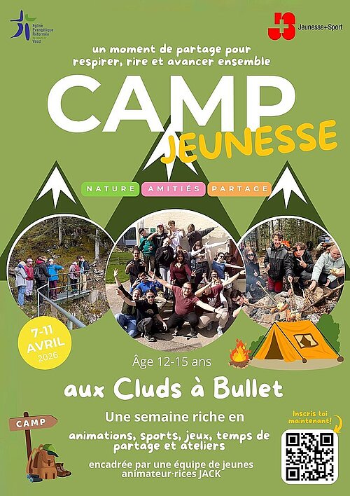 Le Camp de Pâques destiné aux jeunes de 12 à 15 ans (camp Jeunesse + Sport), organisé par l’Église Évangélique Réformée du canton de Vaud, région Lavaux, propose une semaine riche en activités, en rencontres et en moments de partage, du 7 au 11 avril 2026, aux Cluds à Bullet.