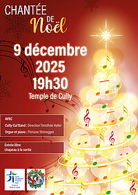 - à 22h30, au temple de Cully, avec C. Huber et V. Lagier, pasteures. A la lumière des bougies, venez écouter le texte de la nativité, chanter les incontournables de Noël et se laisser gagner par l’émerveillement.