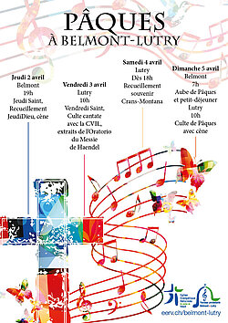 Plongez au cœur de l’espérance avec un programme riche en émotions. Dès le Jeudi Saint, nous nous retrouverons à Belmont pour un temps de communion intime. Le Vendredi Saint, laissez-vous porter par la puissance du "Messie" de Haendel lors d'un culte cantate exceptionnel à Lutry, où la musique devient prière.
