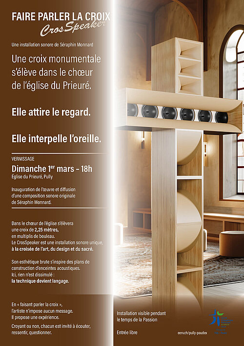 Le design s’invite dans le chœur de l’église du Prieuré à Pully. Dès le 1er mars, découvrez « CrosSpeaker », une croix monumentale et acoustique créée par l’artiste Séraphin Monnard, pour vivre le temps de la Passion d’une manière inédite.