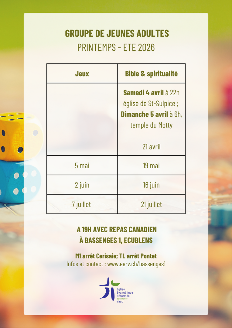 Au programme: repas canadien, partage biblique, chants, discussions, jeux, ou film.