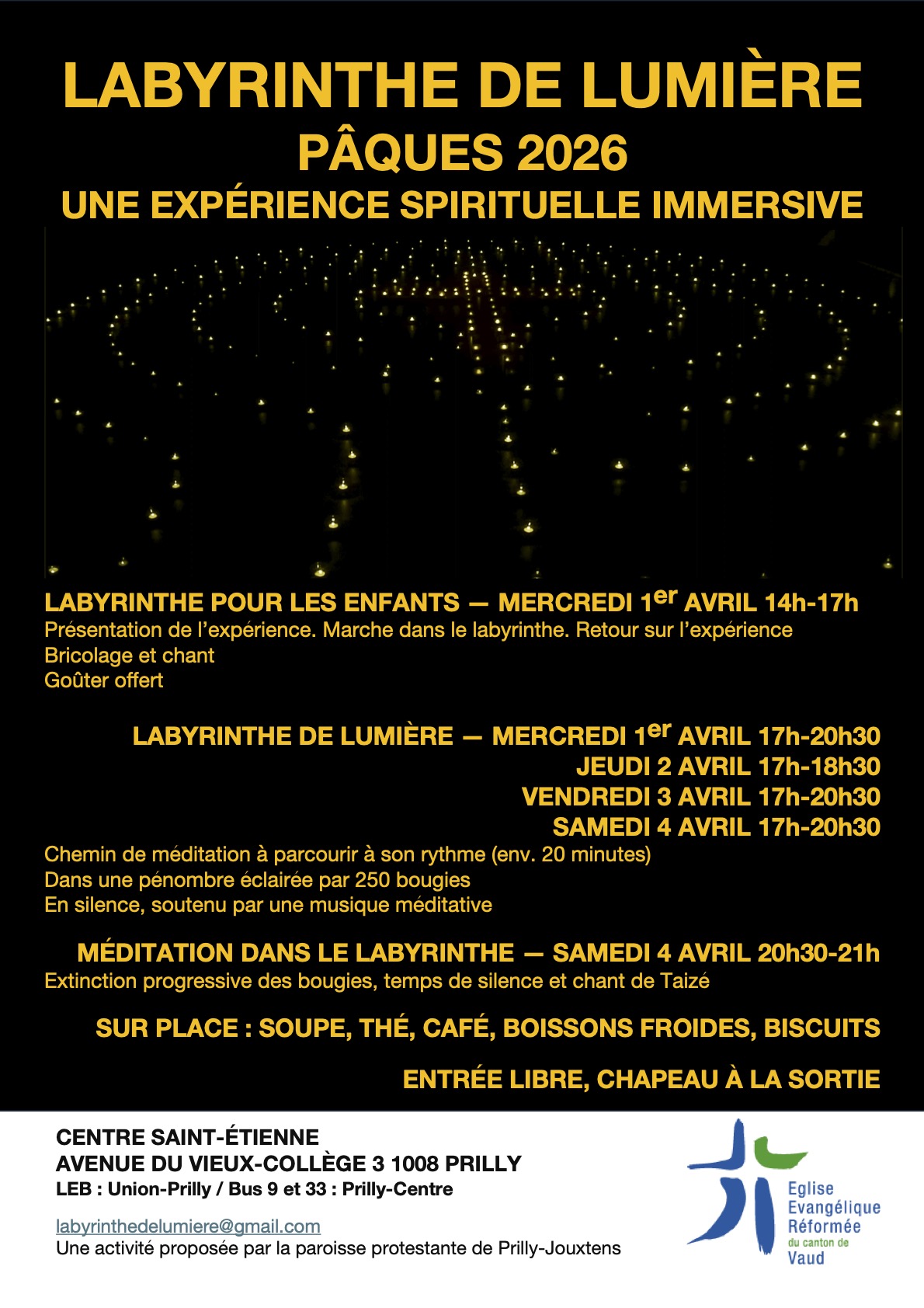 Dans le cadre de nos collaborations avec Prilly et Renens, nous vous proposons à nouveau cette année un « Labyrinthe de lumière » ouvert tout au long de la Semaine sainte, à Prilly.